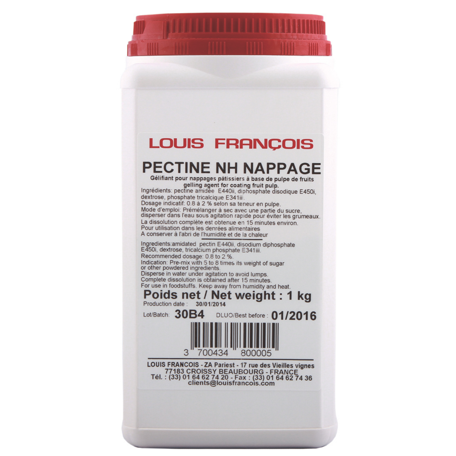 Item Code: LFR017 Description: Louis Francois - Pectine Nh -1Kg Unit: EA Packing: 12 Size: 1 Kg Barcode: 3700434800005 Shelf Life: 21 Months Storage: Dry