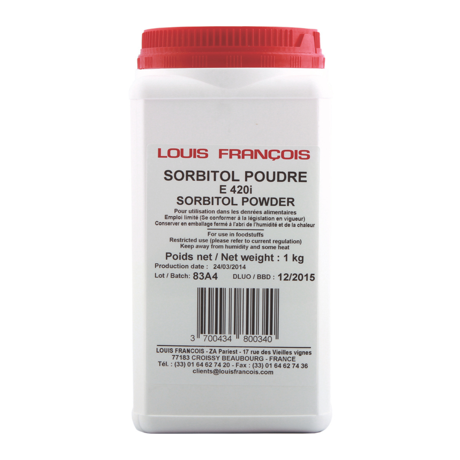 Item Code: LFR019 Description: Louis Francois - Sorbitol Powder -1Kg Unit: CTN Packing: 12 Size: 1 Kg Barcode: 3700434800340 Shelf Life: 23 Months Storage: Dry